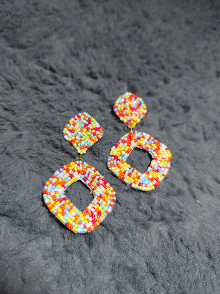 Handmade seed bead earrings in rainbow colors—bold, fun, and perfect for statement looks.