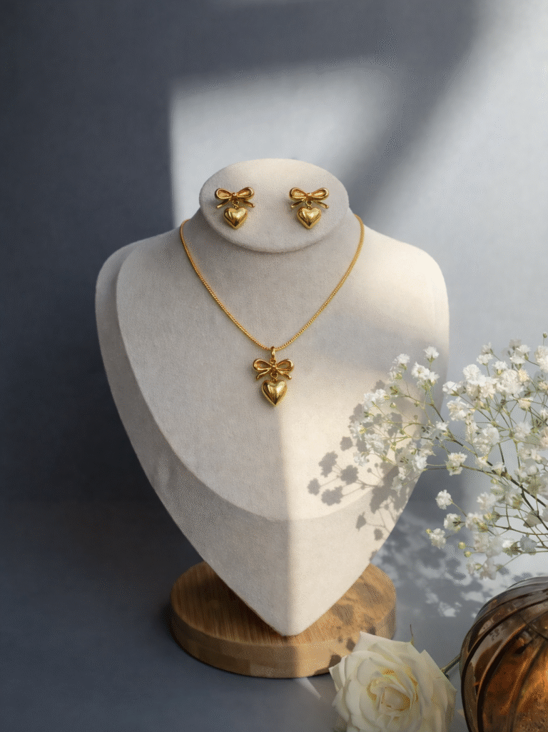 A charming gold-toned bow heart pendant necklace with matching earrings, finished with anti-tarnish coating for elegant everyday wear.