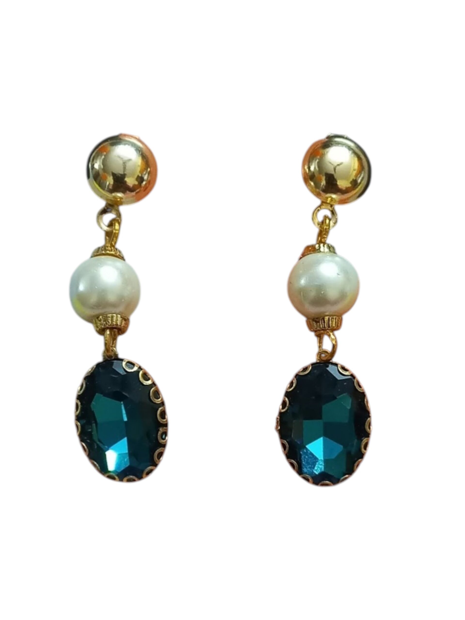 Gold-toned earrings featuring faux pearl and a teal blue enamel drop – stylish and versatile for any occasion.