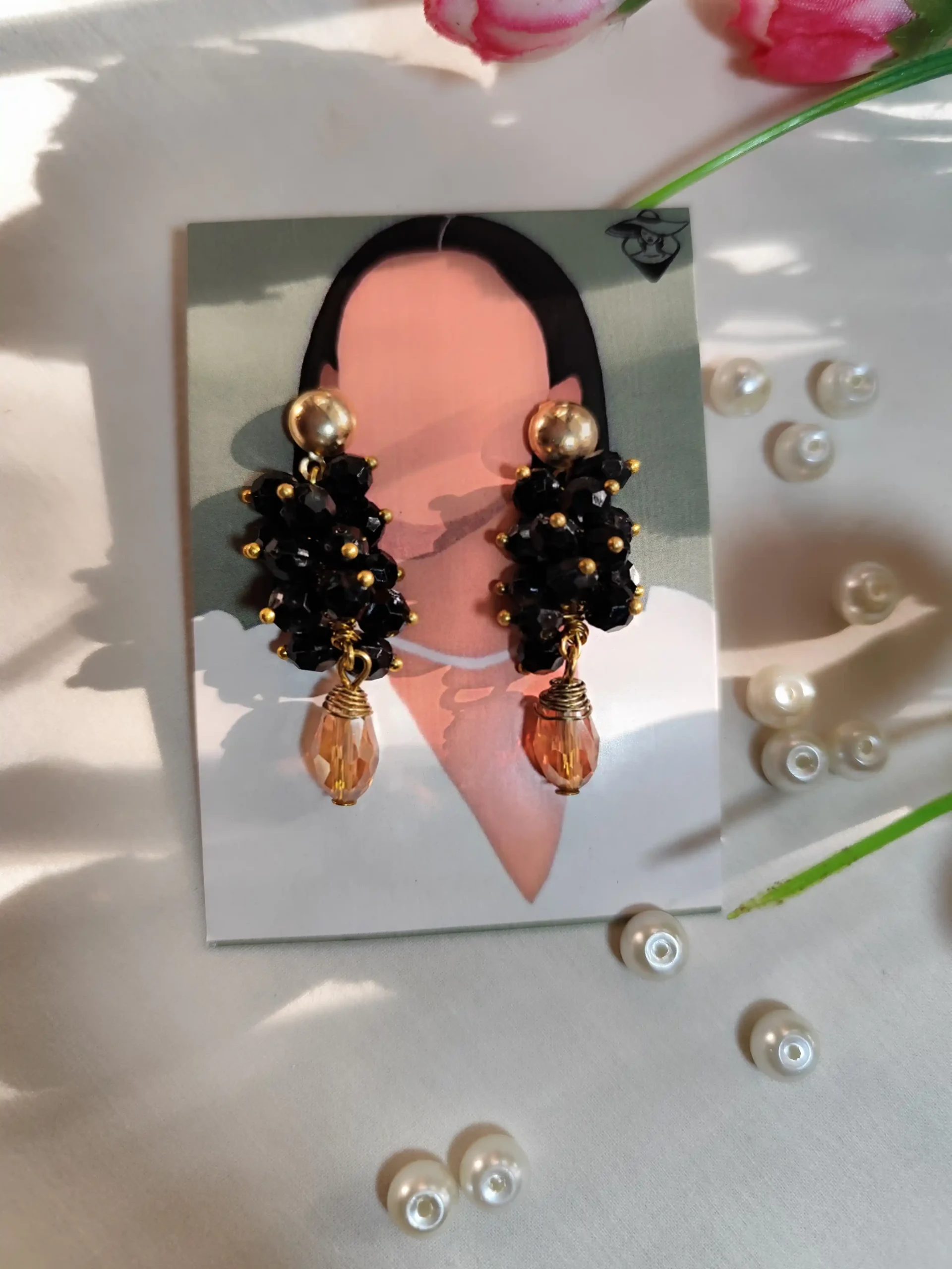 Elevate your style with these sophisticated black cluster beaded earrings, featuring a gold-toned stud top and a dangling amber-colored crystal drop. The rich black beads are arranged in a chic clustered design, accentuated with gold detailing for a luxurious finish. The faceted crystal drop adds a hint of glamor, catching the light beautifully with every movement. Perfect for evening wear, festive occasions, or adding a bold touch to a minimalist outfit.