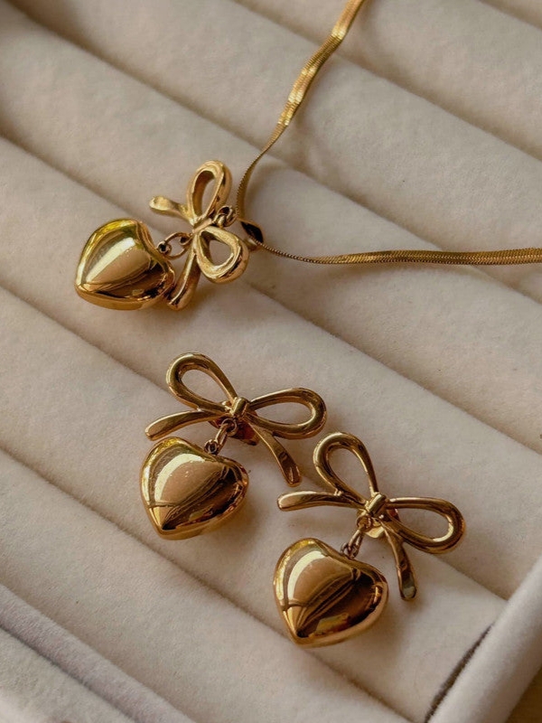 A charming gold-toned bow heart pendant necklace with matching earrings, finished with anti-tarnish coating for elegant everyday wear.