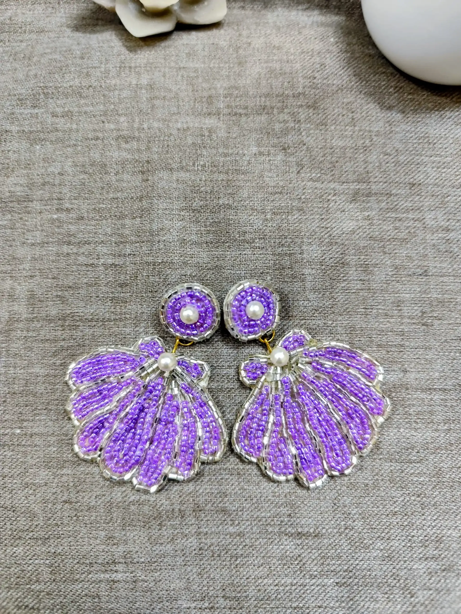 Make a bold yet elegant statement with these Lavender Beaded Shell Earrings. Intricately hand-beaded in vibrant purple and silver hues, these earrings are shaped like delicate seashells, perfect for adding a coastal flair to your look. Embellished with a central pearl detail, they reflect a perfect balance of charm and sophistication. Lightweight and comfortable to wear, they are ideal for beach outings, summer events, or a stylish everyday look with a touch of sparkle.