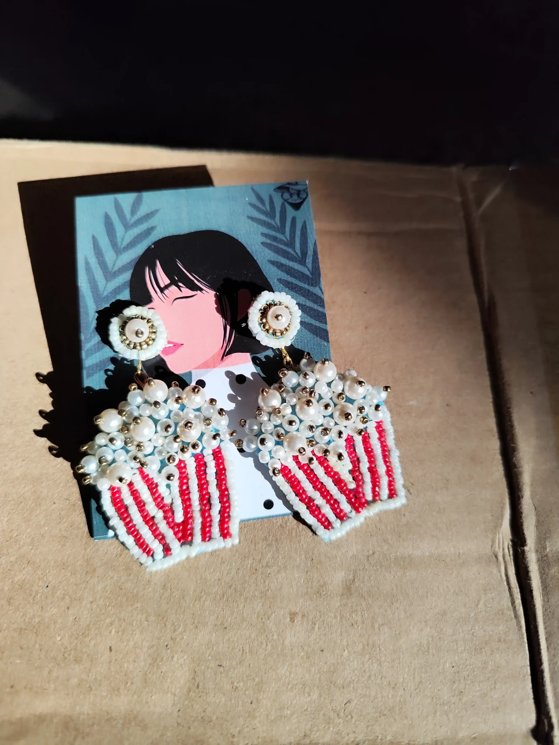 Steal the show with these super fun and quirky Popcorn Party Beaded Earrings! Designed to resemble a classic striped popcorn tub overflowing with 3D pearls and golden beads, these earrings are a total conversation starter. Each pair is carefully handcrafted using high-quality beads in red, white, gold, and pearl tones, offering both glam and playfulness. Perfect for movie nights, parties, or anyone who loves statement accessories with a twist of fun.Whimsical popcorn-themed beaded earrings with pearl and gold accents. Perfect for playful, bold fashion statements.