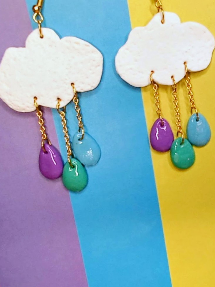 Textured white cloud earrings with colorful raindrop dangles.