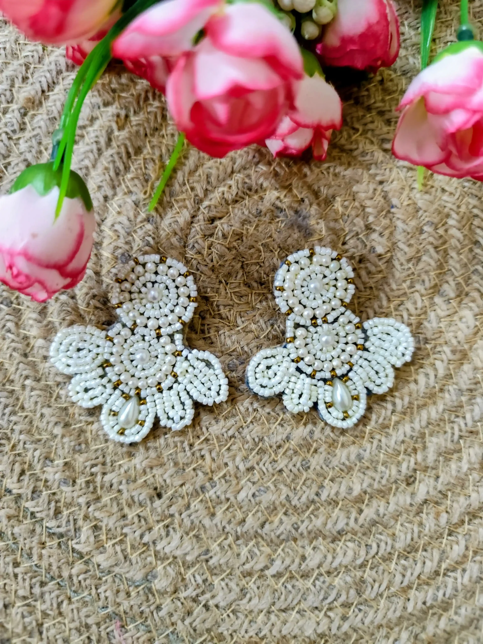 White beaded earrings with pearl accents in an elegant floral-inspired design.