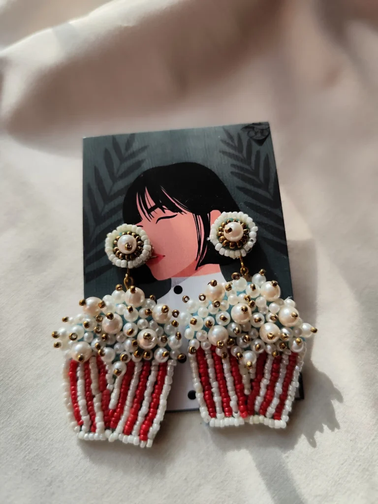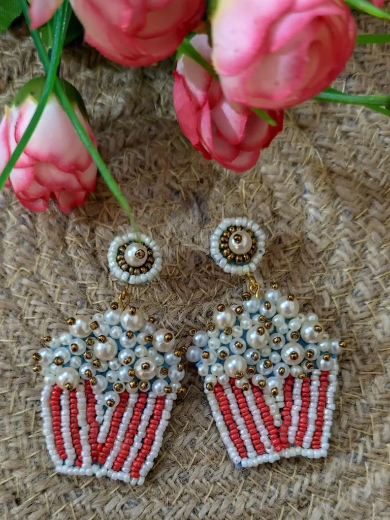 Whimsical popcorn-themed beaded earrings with pearl and gold accents. Perfect for playful, bold fashion statements.